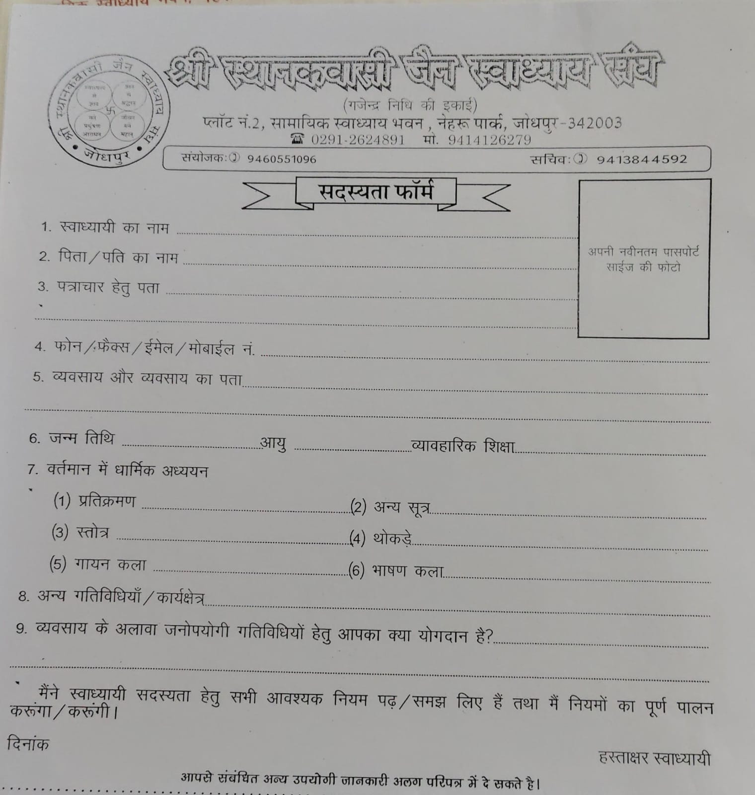 A/c Name : Shri Sthanakvasi Jain Swadhyay Sangh